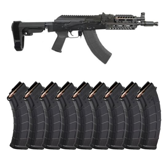 The 4150 barrel is nitride treated for accuracy and durability and is pressed into a new hammer forged front trunnion to ensure the longevity AK-47s are known for. The hardened steel 1mm receiver features a mil-spec style single hook trigger, and side rail mount. The front trunnion and bolt carrier are engraved with GF3 to designate the GF3 hammer-forged model. The pistol is finished with a Magpul polymer handguard, Triangle Side Folding Brace, and Magpul AK-47 polymer grip; Pistol ships with 30 round magazine (where allowed by law).