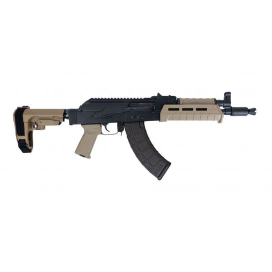 The 4150 barrel is nitride treated for accuracy and durability and is pressed into a new hammer forged front trunnion to ensure the longevity AK-47s are known for. The hardened steel 1mm receiver features a mil-spec style single hook trigger, and side rail mount. The front trunnion and bolt carrier are engraved with GF3 to designate the GF3 hammer-forged model. The pistol is finished with an Aluminum M-Lok Upper/Lower Handguard with Picatinny Top Rail, Triangle Side Folding Brace, and Magpul AK-47 polymer grip; Pistol ships with 30 round magazine (where allowed by law).