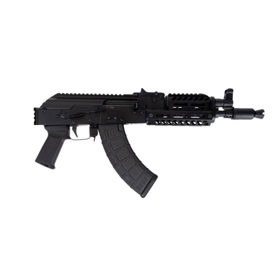 The 4150 barrel is nitride treated for accuracy and durability and is pressed into a new hammer forged front trunnion to ensure the longevity AK-47s are known for. The hardened steel 1mm receiver features a mil-spec style single hook trigger, and side rail mount. The front trunnion and bolt carrier are engraved with GF3 to designate the GF3 hammer-forged model. The pistol is finished with a cheese grater upper handguard, redwood lower handguard and grip, Picatinny Adapter, and a 30 round magazine (where allowed by law).