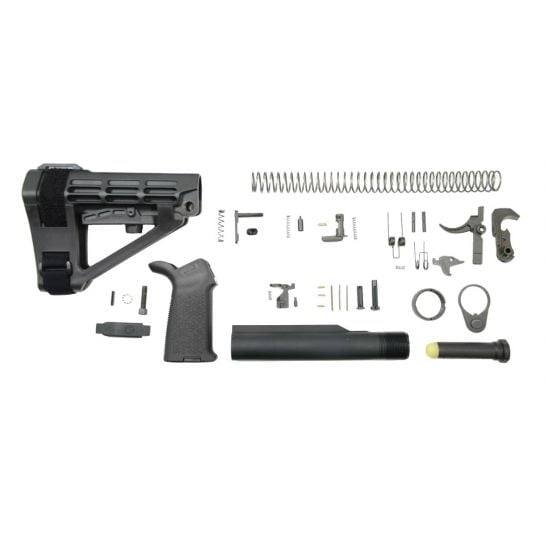 Includes Mission First Tactical Minimalist Stock, Mission First Tactical Engage V2 Pistol Grip, and Mission First Tactical Enhanced Trigger Guard, Palmetto State Armory EPT Lower Parts Kit and Mil-Spec diameter 6-position buffer tube assembly.